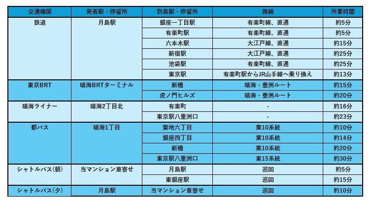 晴海エリアには、鉄道・BRT・路線バスが揃い、都心主要地へのアクセスに優れています。最寄り駅の「月島駅」は、東京メトロ有楽町線と都営大江戸線の2路線が利用可能です。さらに、2020年に運行を開始した「東京BRT」や、都心へ直通するバス「晴海ライナー」、都営バスの停留所はマンションからそれぞれ徒歩5分圏内にあり、日常の移動に幅広い選択肢を備えています。加えて、居住者専用のシャトルバスも平日朝夕に運行し、「月島駅」や「東銀座駅」を結ぶルートを確保。通勤・通学の利便性を一層高めています。以下に主要な交通手段と所要時間をまとめました。